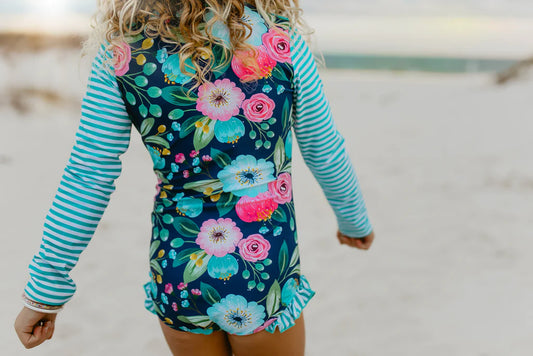Kids Floral Zip Rash Guard One Piece Swimsuit